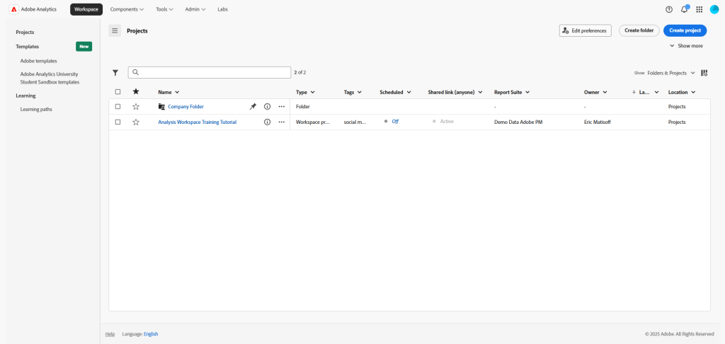 上記の記事でアクセスしたWorkplaceにおいて、「Analysis Workspace Training Tutorial」をクリックします。