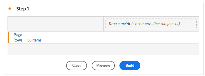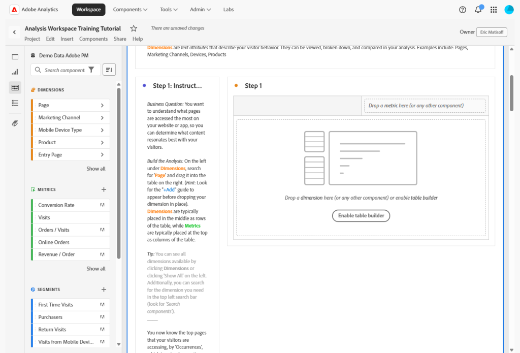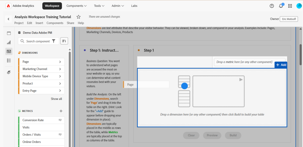 Business Question: You want to understand what pages are accessed the most on your website or app, so you can determine what content resonates best with your visitors.Build the Analysis: On the left under Dimensions, search for ‘Page‘ and drag it into the table on the right. (Hint: Look for the “+Add” guide to appear before dropping your dimension in place). Dimensions are typically placed in the middle as rows of the table, while Metrics are typically placed at the top as columns of the table.